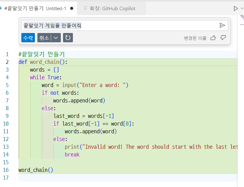 tab 키 : 코파일럿이 제안한 코드를 활용하고 싶을때 누르기. 이외의 키를 누르면 아무일도 안일어난다.
