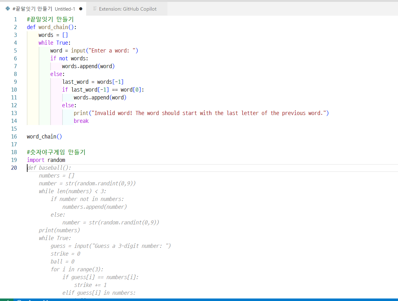 tab 키 : 코파일럿이 제안한 코드를 활용하고 싶을때 누르기. 이외의 키를 누르면 아무일도 안일어난다. 컨트롤+엔터 : 다른 코드들을 제안받는다. 좀더 긴 코드를 추천해준다. 코파일럿은 비쥬얼