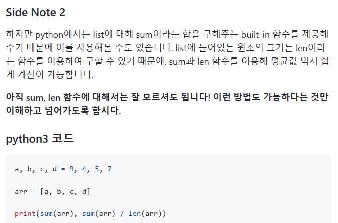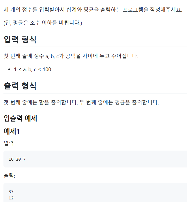 - 문제 : 세수의 합과 평균 코드트리 | 코딩테스트 준비를 위한 알고리즘 정석 (codetree.ai)