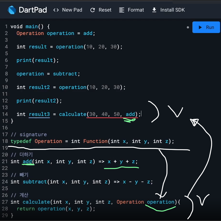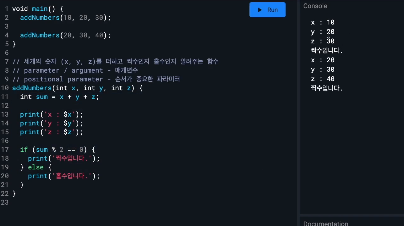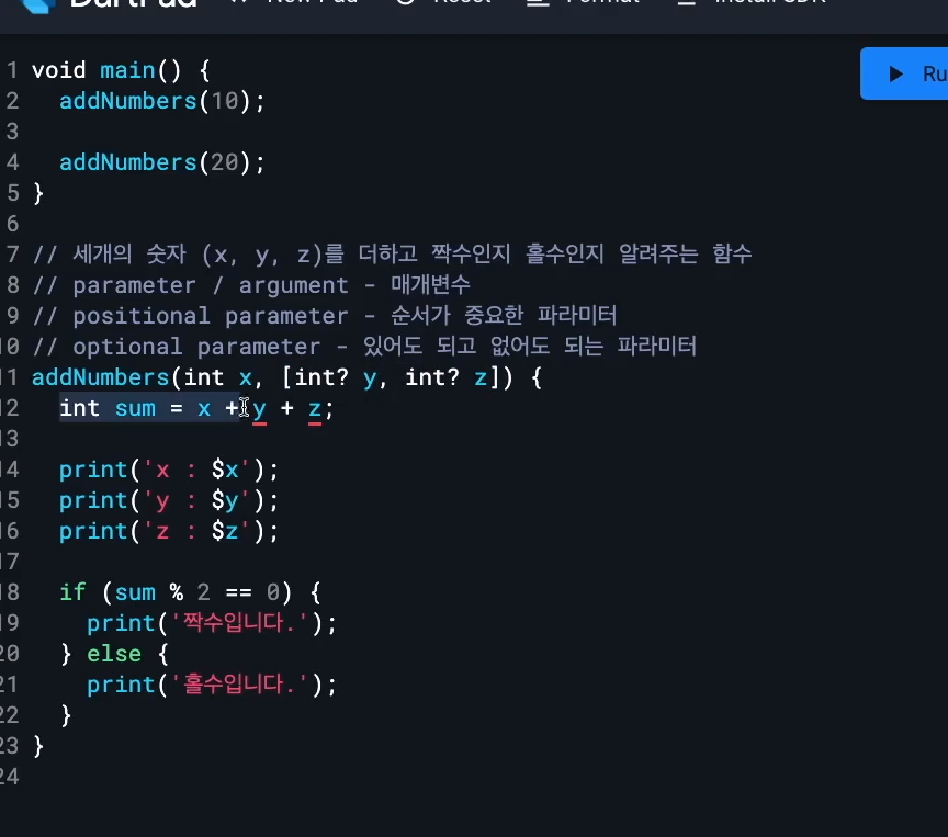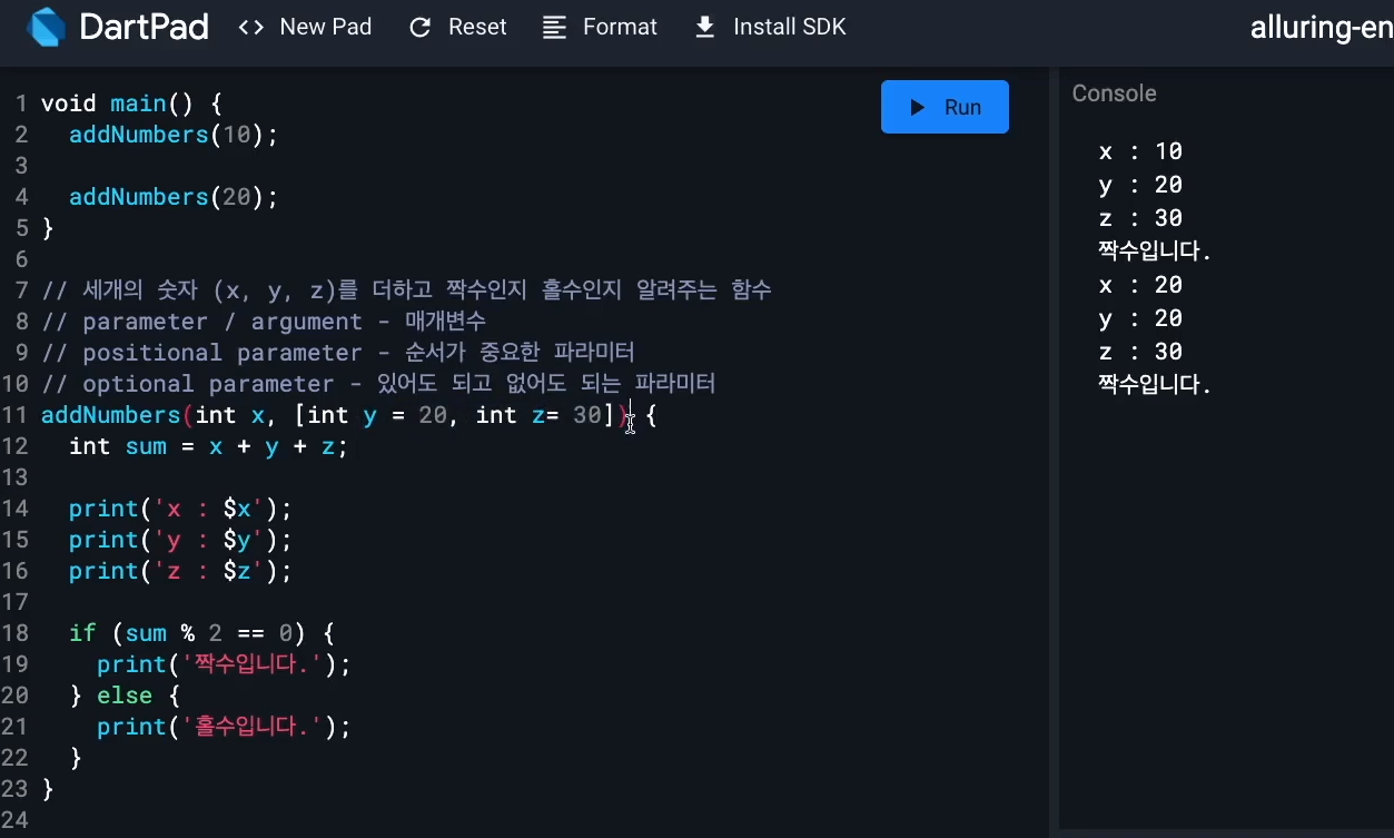함수 선언및 작성 예시 6 - named parameter 에서 optional parameter :옵셔널. 있어도 되고 없어도되는거 안넣어도 됨